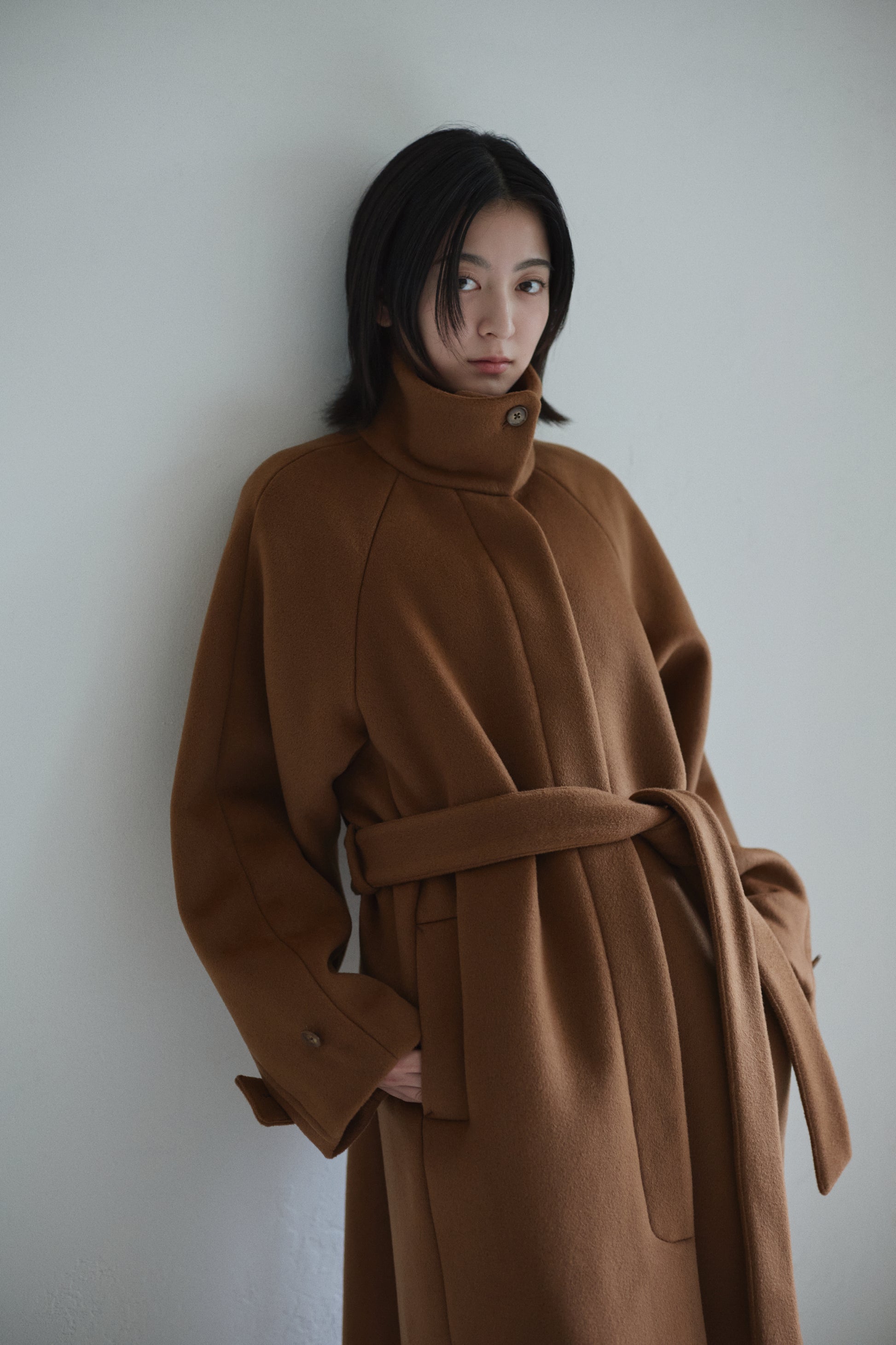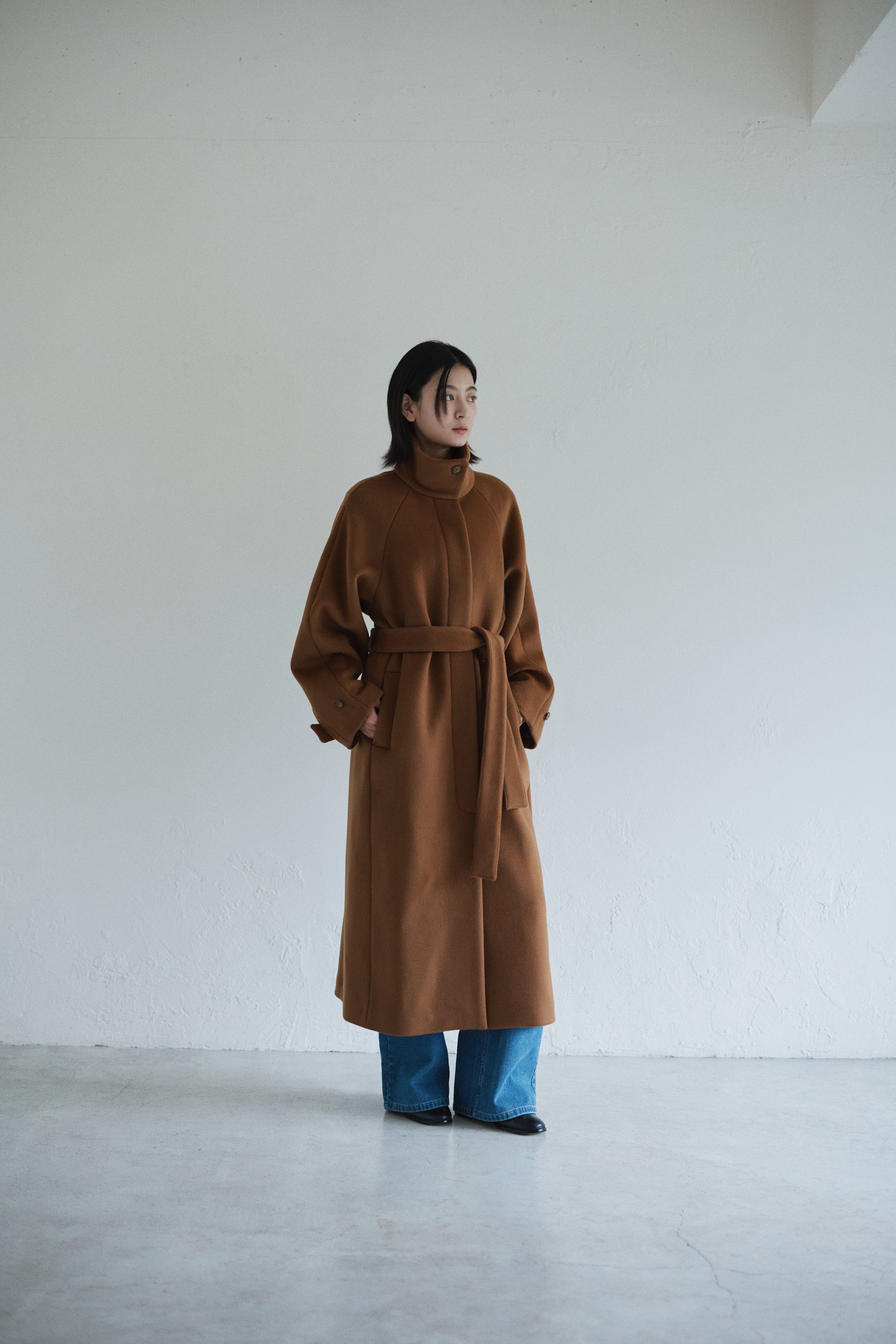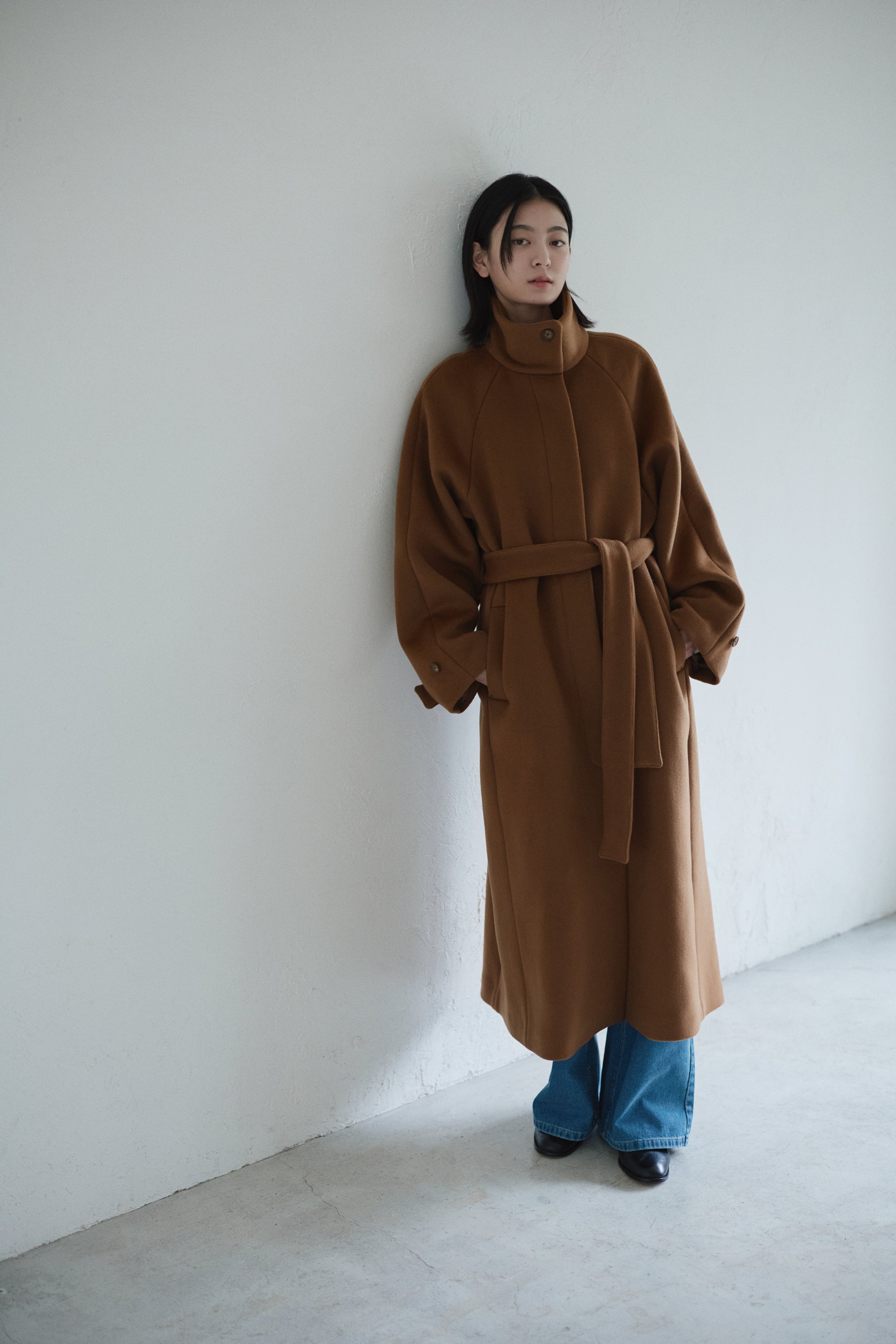 ウール100%の生地をたっぷりと使用したラグランスリーブのロングコート。