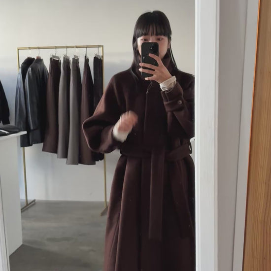 オーストラリア産の厳選されたウール100%の生地をたっぷりと使用したラグランスリーブのロングコート。
